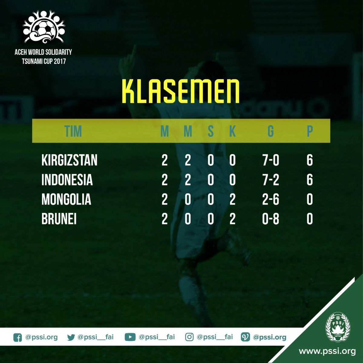 Dengan hasil ini, Indonesia menempati urutan kedua klasemen sementara Aceh World Solidarity Cup 2017 dengan enam poin.
