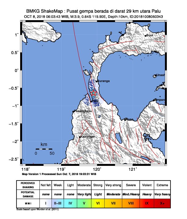 #Gempa Mag:3.9, 08-Okt-18 06:03:43 WIB, Lok:0.64 LS, 119.90 BT (Pusat gempa berada di darat 29 km utara Palu), Kedlmn:10 Km Dirasakan (MMI) III Palu #BMKG