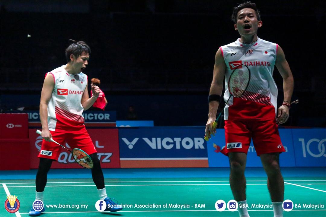 Ganda putra Indonesia, Fajar Alfian/Muhammad Rian Ardianto, kandas di tangan wakil Jepang, Takeshi Kamura/Keigo Sonoda, dengan skor 13-21, 20-22.
