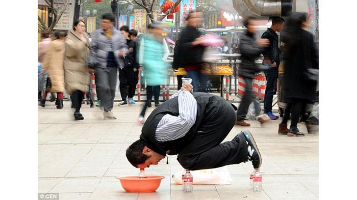 Seorang pria mengemis dengan cara yang tak biasa di jalanan Kota Jinhua
