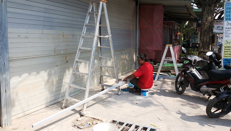 Sudah dua minggu, ia membetulkan rolling door sebuah tempat fotocopy.