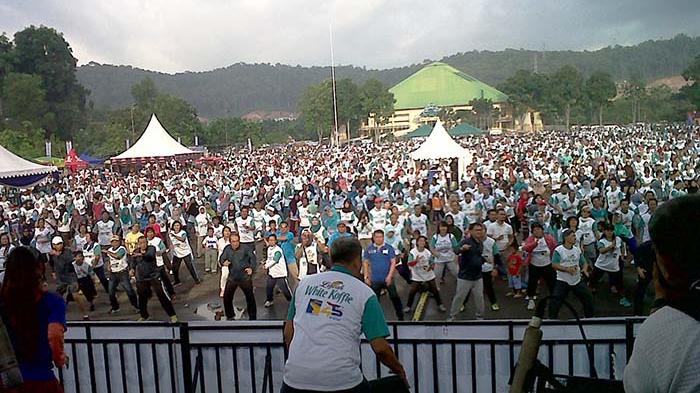 Aksi Tukul Arwana (tengah) Senam Zumba di atas panggung di acara Melangkah dan Gowes BP Batam bersama Tribun Batam dalam rangka hari bakti BP Batam ke-45 di lapangan parkir Temenggung Abdul Jamal, Batam, Sabtu (29/10/2016).