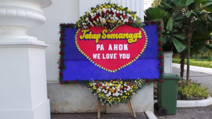 Karangan bunga itu bertuliskan, "Tetap Semangat Pak Ahok. We Love You".