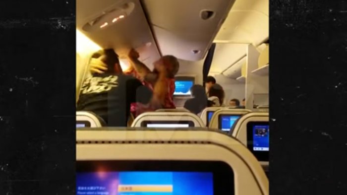 Dalam sebuah video yang muncul di dunia maya, terlihat seorang pria, yang diyakini adalah warga AS dan mengenakan pakaian motif Hawaii berwarna merah menghajar penumpang lain yang mengenakan kaus hitam.