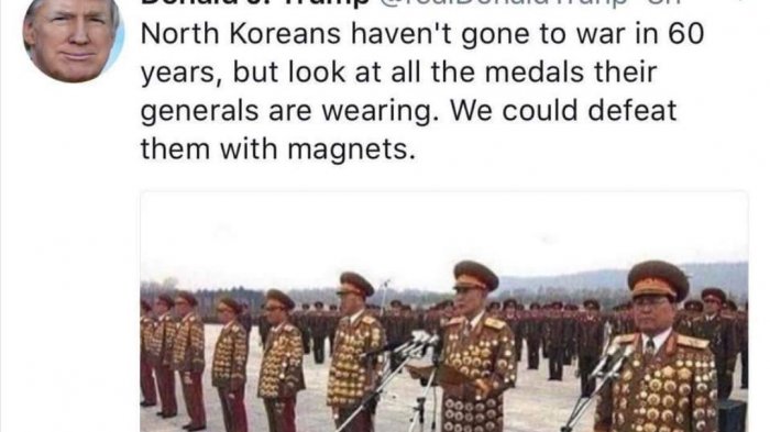 Trump mengejek Korut sebagai negara yang tidak akan berkutik kalau pecah perang karena sudah 60 tahun, Korut tidak pernah perang, sehingga negara ini akan mudah ditaklukkan.
