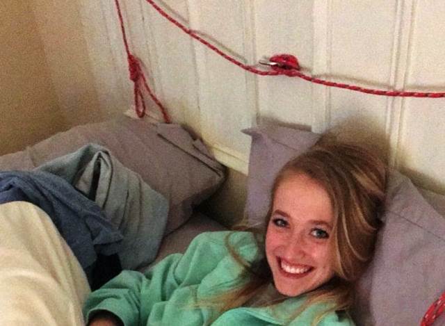 Di belakang Meghan ada tali merah panjang yang digantungkan di headboard.