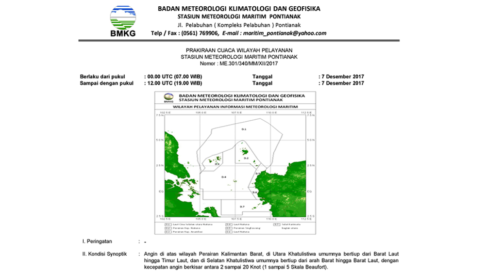 Kecepatan angin 3 sampai 15 knots dengan ketinggian gelombang 0.3 meter sampai 0.8 meter.