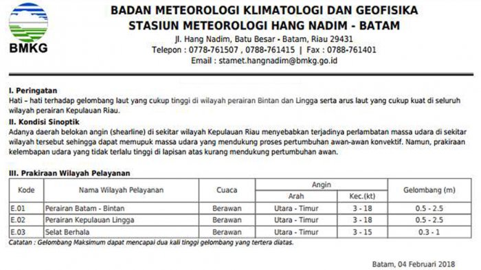 Prakiraan cuaca di Perairan Kepri ini berlaku mulai Senin (5/2/2018) pukul 07.00 WIB sampai pukul 19.00 WIB.