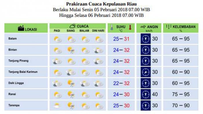 Berikut Prakiraan Cuaca Kepulauan Riau, dari Badan Meteorologi Klimatologi Geofiksika (BMKG) Stasiun Meteorologi Klas I Hang Nadim Batam.