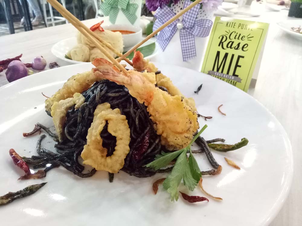 Dalam acara soft opening beberapa hari lalu, tampilan mie terlihat cukup unik dan bikin penasaran. Dimasak dengan campuran tinta sotong membuat warna mie terlihat cukup hitam.