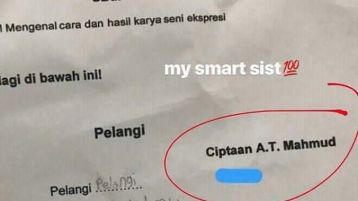 Pada kertas ujian tersebut, sang bocah diminta untuk melengkapi lirik lagu Pelangi yang diciptakan A.T. Mahmud.