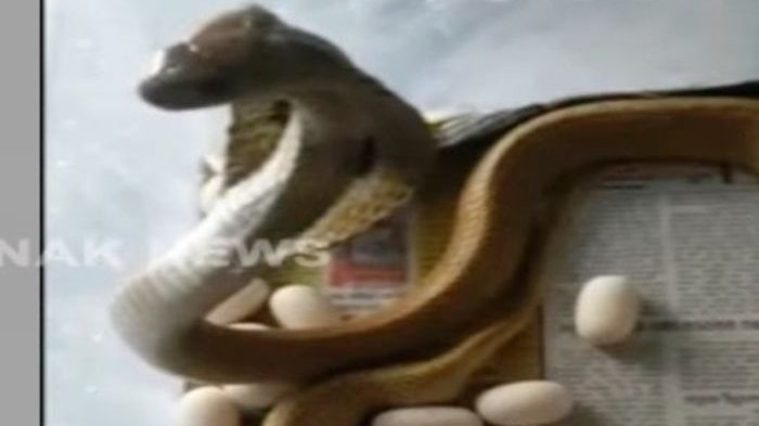 Dalam video itu terlihat induk kobra bertelur butir demi butir di dalam sebuah kotak plastik yang berlubang.