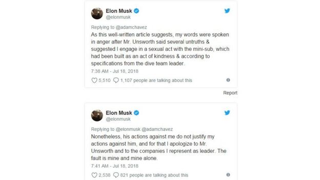Musk membalas lewat twitt, tanpa menyebut nama Unsworth, tetapi dia mengacu kepada "pria asing Inggris yang tinggal di Thailand".