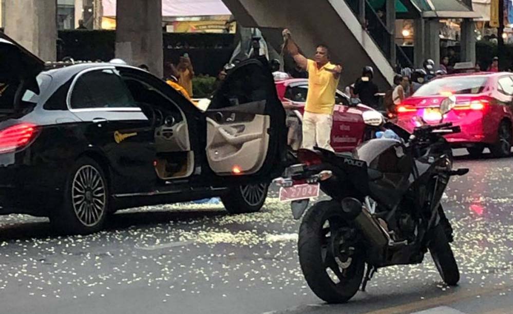 Dari video yang diunggah di Twitter menunjukkan bahwa pria berpakaian kuning tersebut meletakkan foto Raja Thailand di kap dan kaca depan mobilnya.