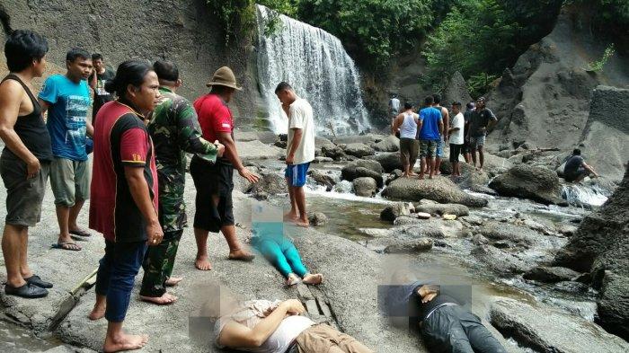 Kejadian nahas ini, bermula saat korban sedang mandi di bawah air terjun, tiba-tiba batu dari atas dinding air terjun menggelinding jatuh ke bawah, sehingga menimpa para korban yang sedang mandi.