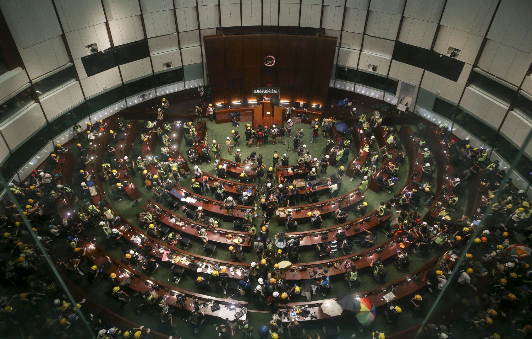 Setelah berjam-jam mengepung bangunan itu, menghancurkan pintu kaca dan melepas jeruji logam, para pengunjuk rasa menyerbu masuk ke gedung dengan menyemprotkan grafiti di kamar itu dan merusak potret presiden Legco sebelumnya.