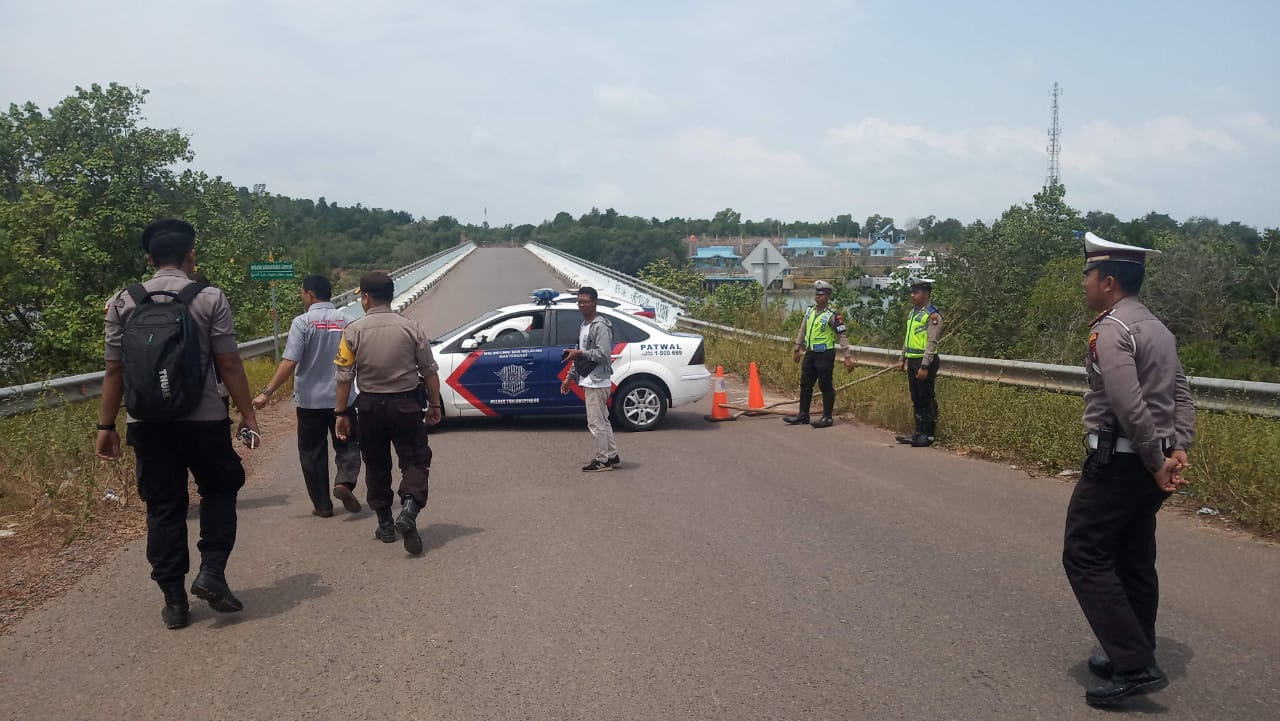 TRIBUNBATAM.id, TANJUNGPINANG - Kepala Satuan Lalu lintas (Kasat Lantas) Kepolisian Resort (Polres) Tanjungpinang, Ajun Komisaris Polisi (AKP) Krisna menutup sementara jalan yang melewati Jembatan 2 Pulau Dompak, Kota Tanjungpinang, Provinsi Kepulauan Riau (Kepri), Rabu (7/8/2019) siang.