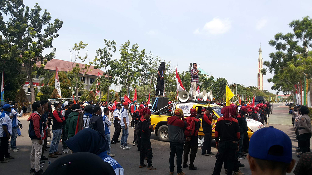 Di halaman kantor Walikota Batam Senin (12/8/2019) pagi, ratusan buruh yang tergabung dalam FSPMI dan beberapa organisasi buruh lain, menyuarakan aspirasi secara terbuka.