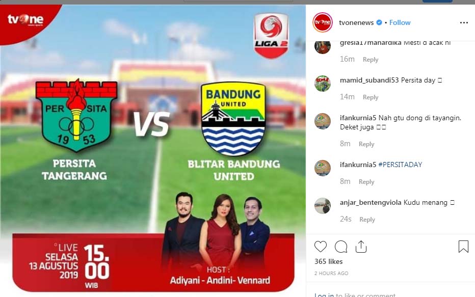 Pertandingan Persita Tangerang vs Persib B juga akan disiarkan secara langsung di TVOne sore ini.