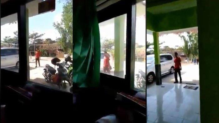 Dalam rekaman video beredar berdurasi 29 detik, tampak guru ketakutan menyaksikan remaja menggunakan kaos warna merah, dan celana panjang cokelat, membawa sebilah sabit.