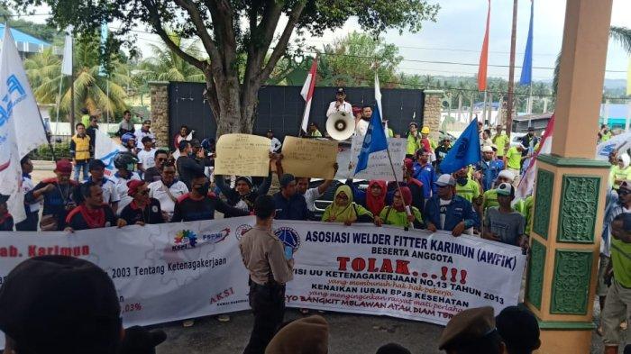 Ratusan pekerja dari tiga serikat buruh di Kabupaten Karimun menggelar demonstrasi