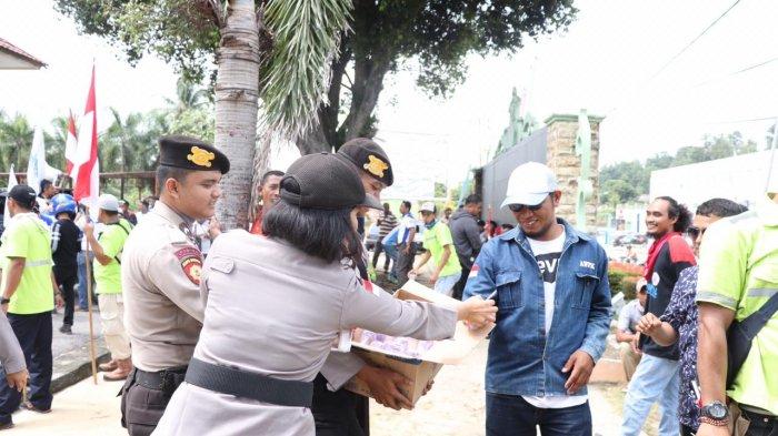Polisi Wanita (Polwan) terlihat memberikan bantuan air mineral kepada para pekerja yang sedang melakukan aksi damai