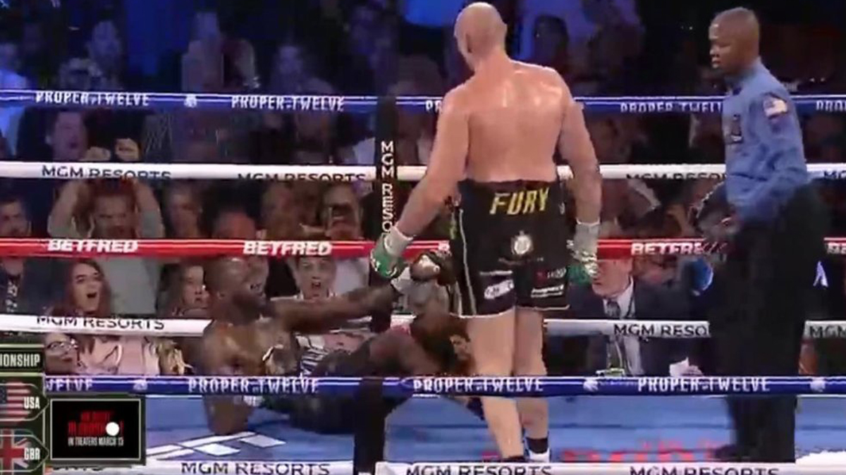 Momen saat Deontay Wilder terjatuh setelah kena pukul Tyson Fury dalam pertarung tinju dunia, Sabtu (22/2/2020) malam atau Minggu pagi WIB