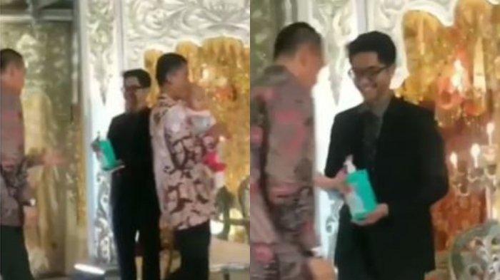 Dalam video tersebut, seorang pria berjas hitam tampak membawakan sebotol hand sanitizer di panggung pelaminan.