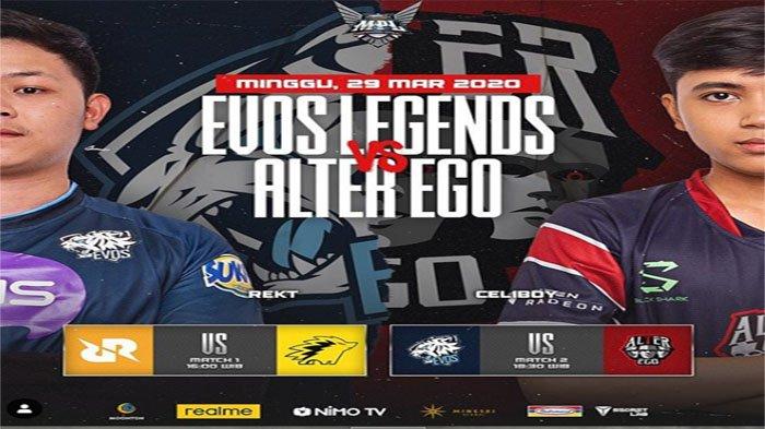 RRQ Hoshi vs ONIC Esports dan Evos Legends vs Alter Ego akan bertemu hari ini, Minggu (29/3) mulai pukul 16.00 WIB.