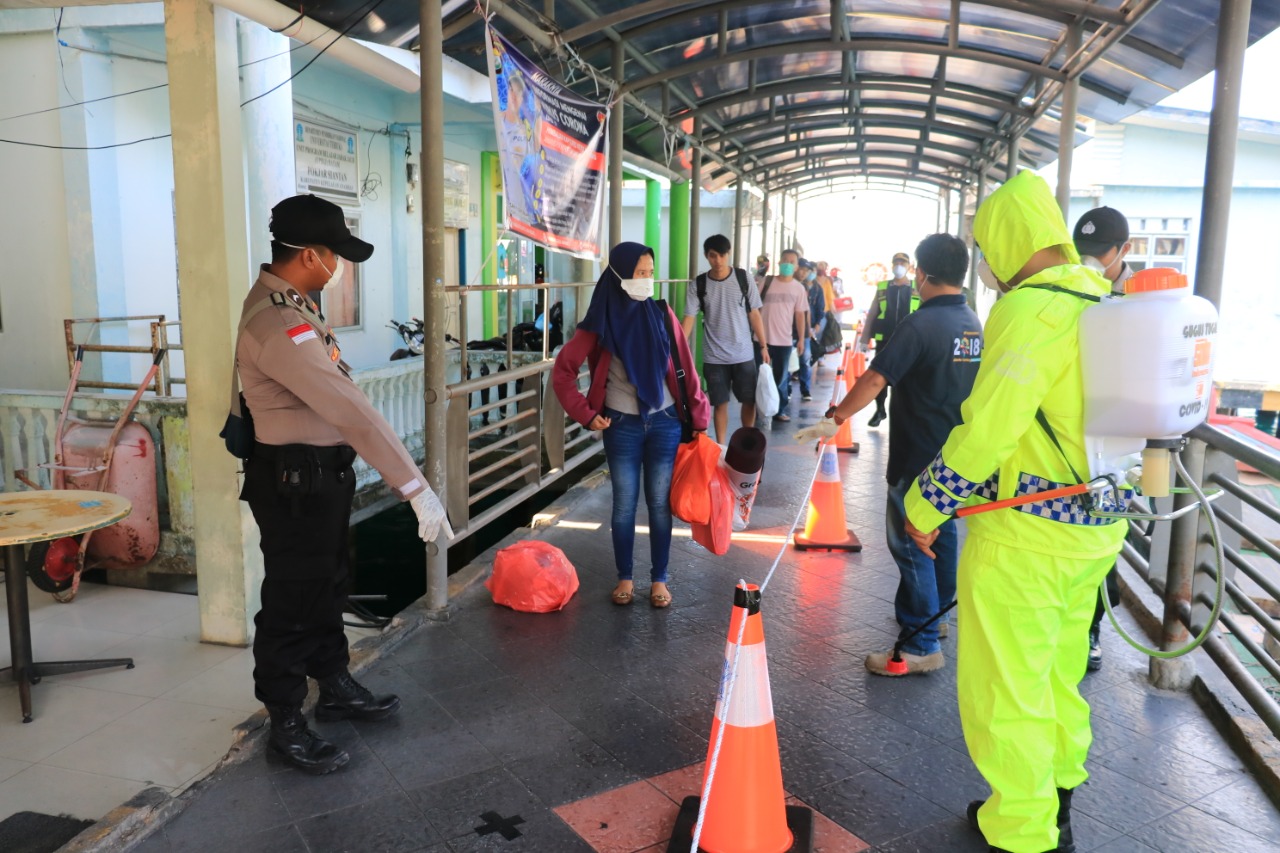 Tak hanya pengukuran suhu tubuh saja, para penumpang juga disemprot cairan disinfektan di sepanjang jalan menuju keluar pelabuhan Sri Siantan.