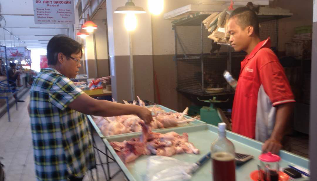Ilustrasi. Seorang konsumen sedang memilih daging ayam segar di Pasar Pasir Putih, beberapa waktu lalu.