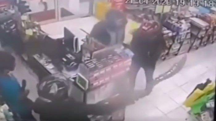 Dari video yang beredar, tampak 4 pria memakai topeng memasuki minimarket dan langsung menodongkan parang ke kasir.