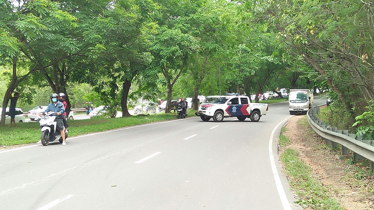 Terpantau dari lokasi Pura Agung Amartha Buana, arus jalan menuju Tiban ditutup.