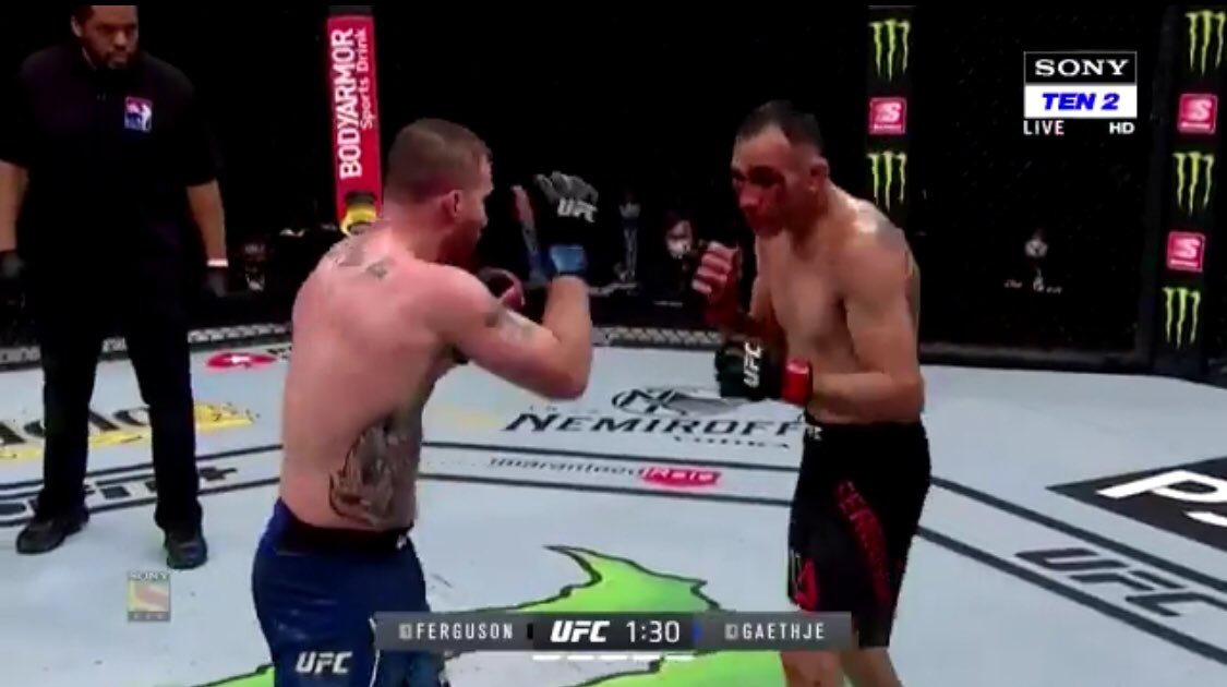 Gaethje menutup ronde kelima dengan melepaskan dua pukulan tangan kiri yang tepat mengenai wajah Ferguson.