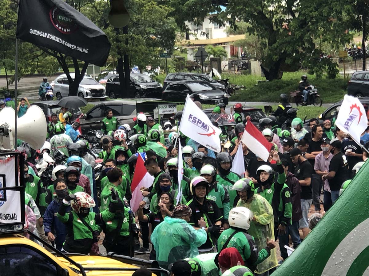 Hujan deras tidak menghalangi semangat driver untuk menyalurkan protes mereka akan kebijakan yang dikeluarkan PT. Gojek Indonesia.
