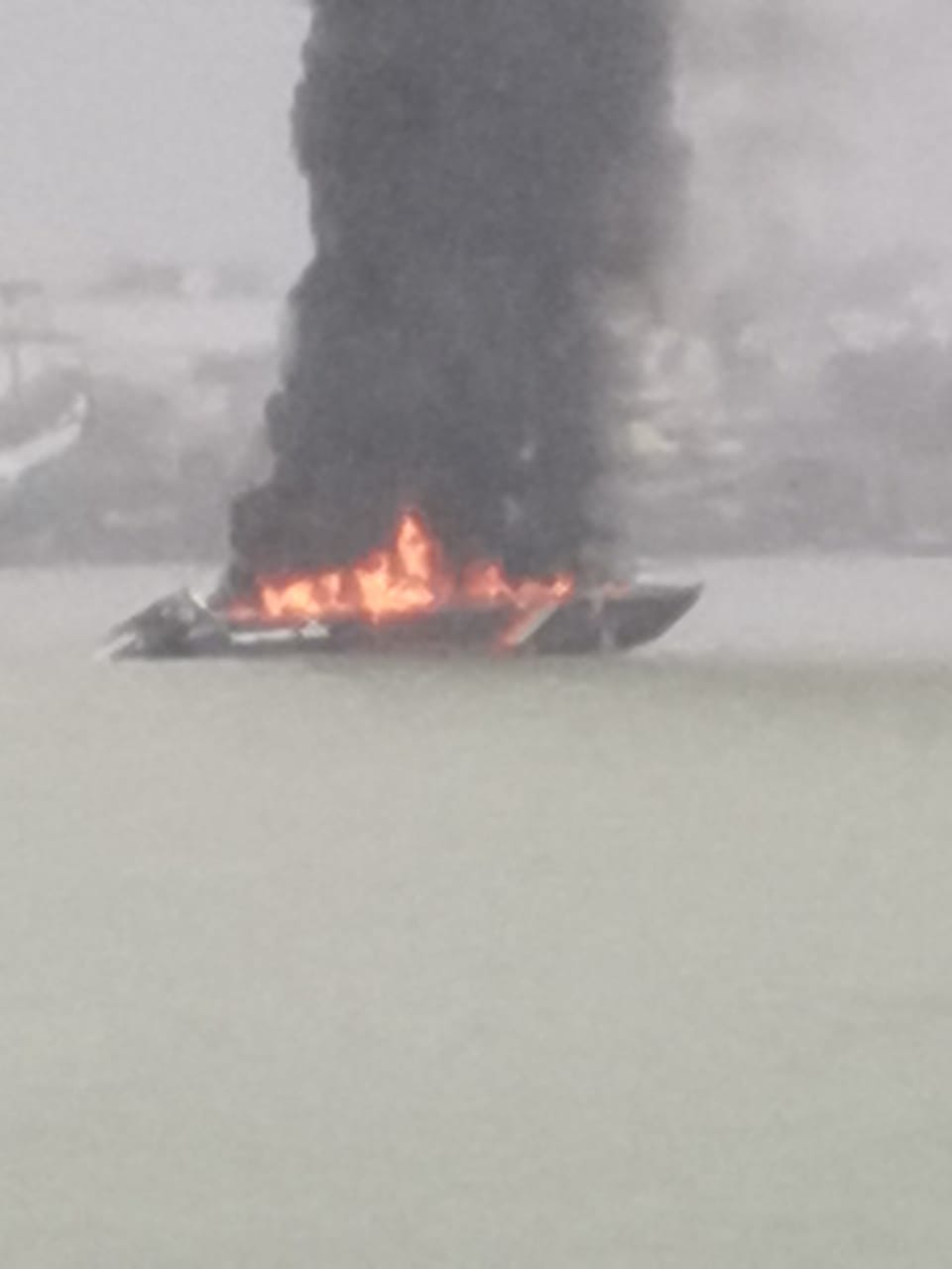 Hampir satu jam terbakar, speedboat berbahan fiber kemudian tenggelam ke dalam laut.