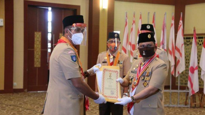TRIBUNBINTAN.com, BINTAN - Bupati Bintan, Apri Sujadi dan Wakil Bupati Bintan Dalmasri Syam menerima tanda penghargaan Lencana Melati dari Ketua Kwartir Nasional (Kwarnas) Komjen Pol. (Purn) Budi Waseso yang disematkan langsung oleh Sekda Provinsi Kepri TS Arief Fadilah di Dompak, Selasa (25/8/2020).