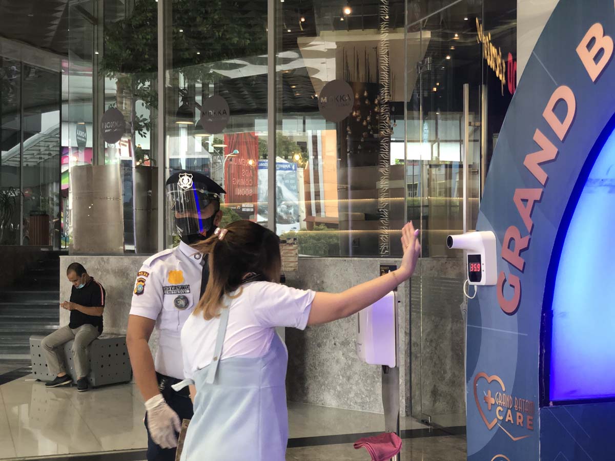 Memeriksa suhu tubuh ketika memasuki mal. Selama mengantre, pengunjung juga wajib menjaga jarak.