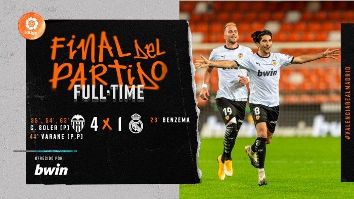 Pertandingan Valencia vs Real Madrid berakhir dengan skor 4-1 untuk kemenangan tuan rumah pada Minggu (8/11/2020) malam atau Senin dinihari WIB.