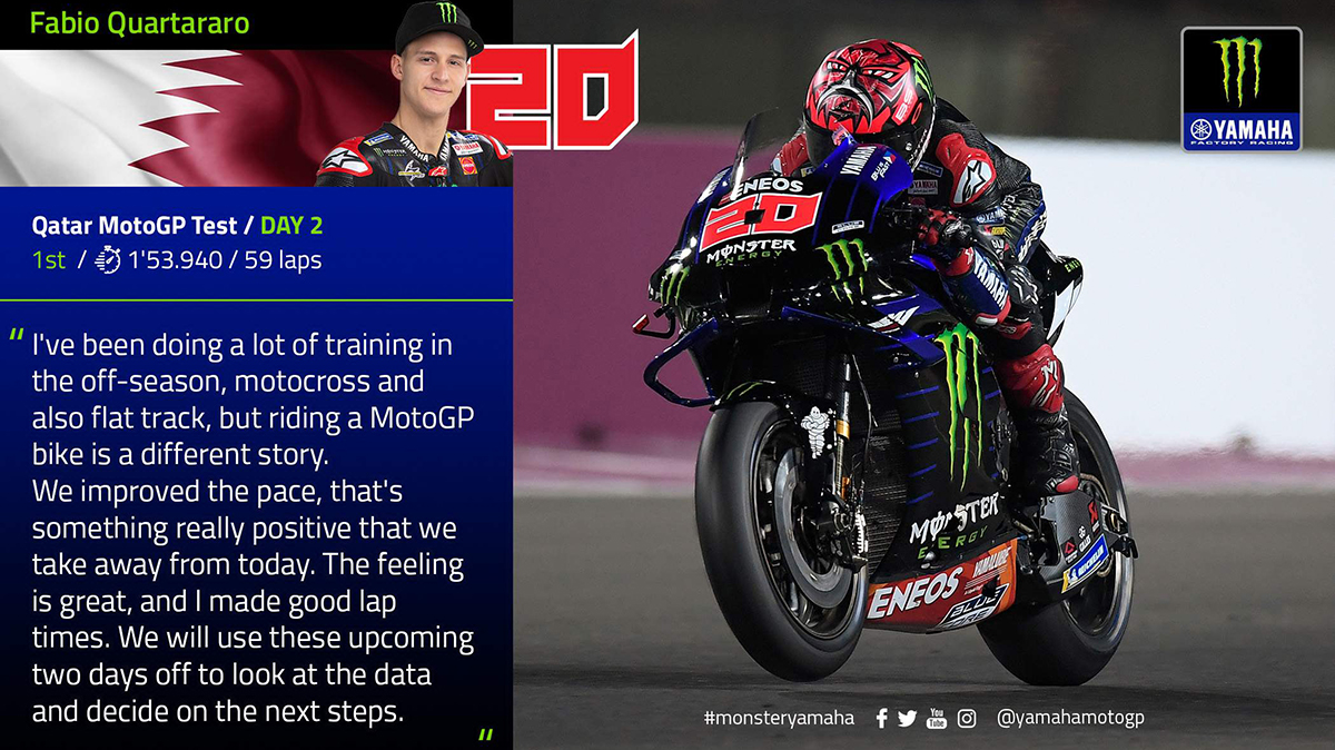 Pada sesi kedua tes MotoGP Qatar, Fabio Quartararo menempati peringkat pertama dengan catatan waktu lap tercepat, 1 menit 53,940 detik.