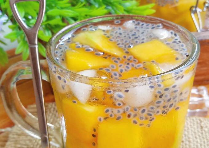 - Terakhir tambahkan es batu secukupnya. Es serbat mangga siap disajikan.