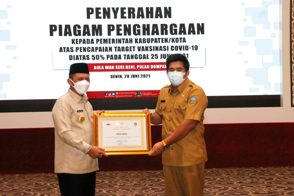 Gubernur Kepri Ansar Ahmad menyampaikan, bahwa Pemprov Kepri memberikan reward (penghargaan) kepada kabupaten/kota di Kepri yang berhasil mencapai target vaksinasi covid-19 di atas 50 persen.