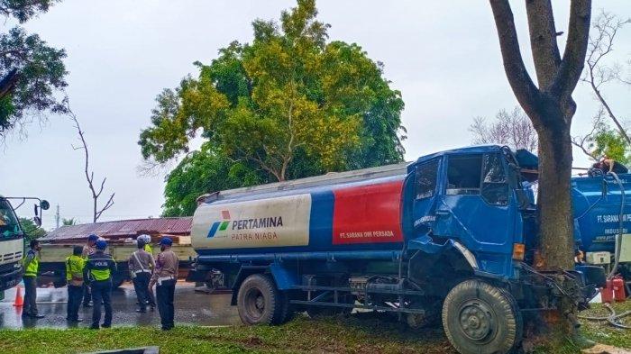 Mobil tangki berwarna biru dengan nomor polisi BP 9861 DD milik PT Sarana Dwi Persada tersebut menabrak trotoar serta menghantam pohon sekira pukul 13.20 WIB.