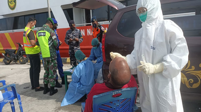 Petugas mengambil swab hidung ABK KM Victori di Pelabuhan Penagi Natuna, Selasa (3/8/2021). Dari tracing yang dilakukan seorang kru kapal positif covid-19 dari hasil tes antigen