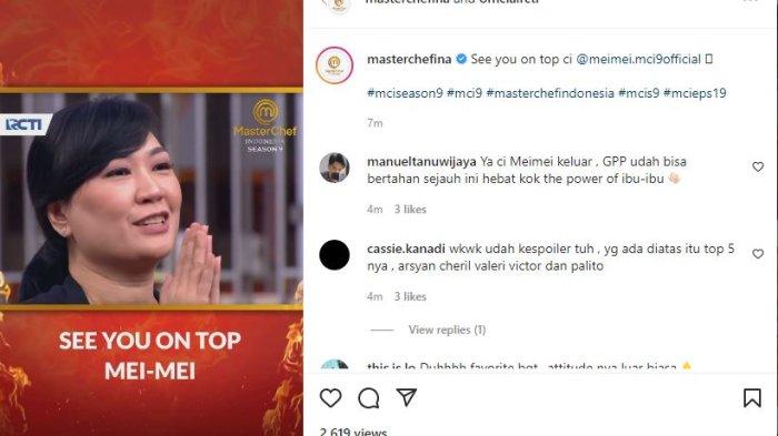 Mei Mei tereliminasi dari Masterchef Indonesia 9 setelah melewati tiga ronde di babak pressure test. Gagal saat masakan masakan ayam geprek.