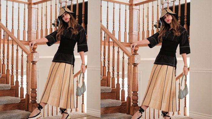 Dalam penampilannya kali ini, Luna Maya mengenakan topi, baju atasan, rok, tas, serta sandal dari brand pakaian Tory Burch. Berapa total harganya?