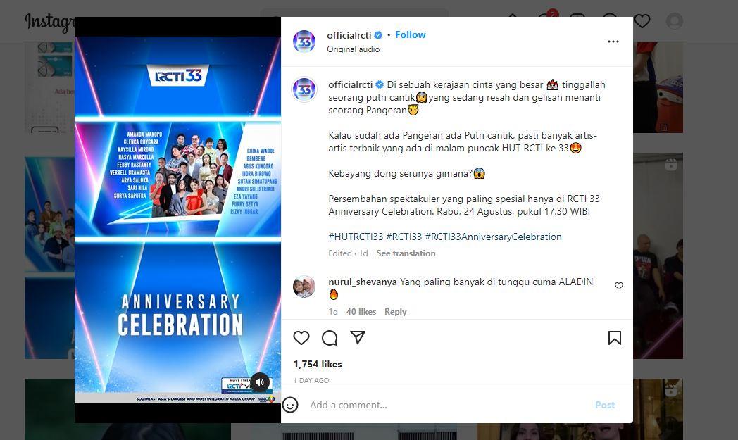 Amanda Manopo dan Arya Saloka sapa fans lewat Anniversary Celebration RCTI ke 33 tahun. Fans "ALADIN" berharap mereka punya chemistry lagi.