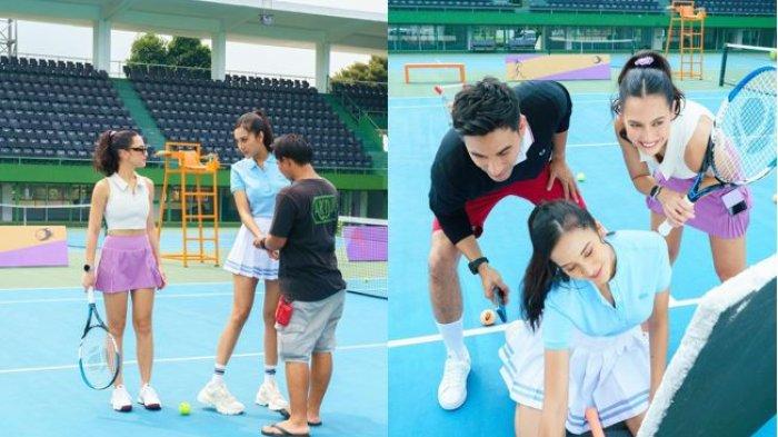 Pevita Pearce yang saat itu kenakan baju berwarna putih tengah membawa raket tenis.