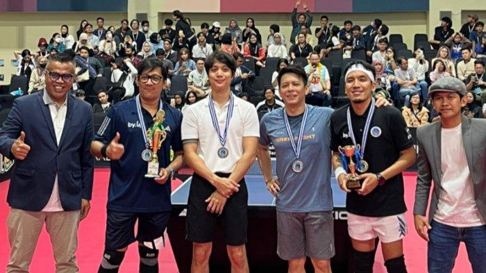 Andre Taulany membawa piala bertuliskan Juara Main Pingpong meski menjadi juara empat usai kalah dari Desta dan Dikta di ekshebisi pingpong VDKaTe.