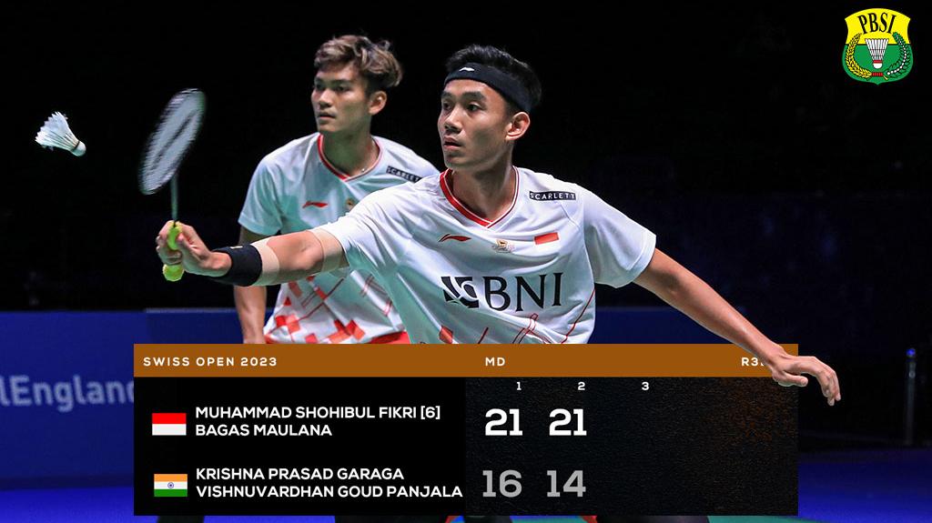Fikri/Bagas lolos ke 16 besar Swiss Open 2023 setelah mengalahkan Krishna Prasad Garaga/Vishnuvardhan Goud Panjala dari India dengan skor 21-16, 21-14.